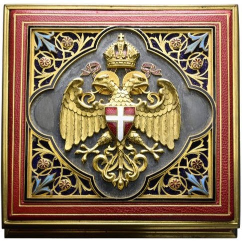 The medal was presented in a richly decorated, leather-covered wooden box with gold-embossed edges. The lid features an octagonal medallion with a crowned double-headed eagle and an enamelled coat of arms of Vienna. The interior is lined with silk and blue velvet, and the lid closes with a screw cap – a particularly high-quality detail.