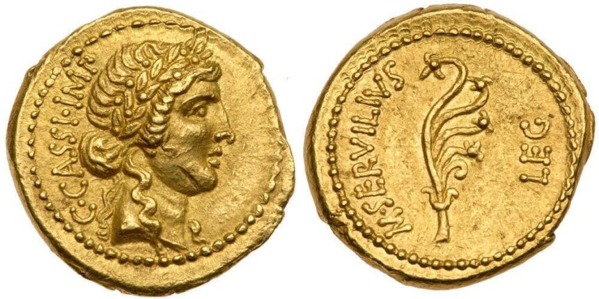 The murder of the world’s most famous imperator, and the civil war that spurred the rise of one of history’s great empires — we see a moment from that time, frozen on this aureus of gleaming gold. Gaius Cassius Longinus, co-conspirator with Brutus in the assassination of Julius Caesar, here proclaims liberty in his own name for the Roman people. Even now, the aplustre symbol on the reverse still boasts his ill-fated declaration of naval supremacy, an immortal testament of his hubris.