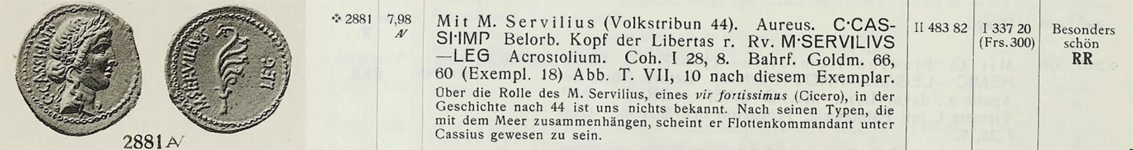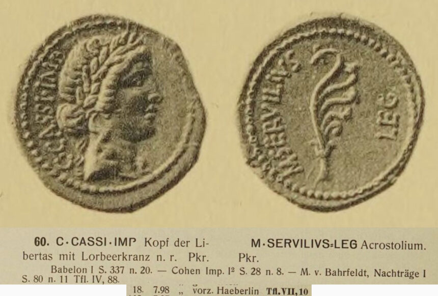 While in the possession of Haeberlin, the Cassius aureus passed through the hands of Dr. Max von Bahrfeldt, who published the coin as the only plated example of its type in his 1923 reference work, Die römische Goldmünzenprägung während der Republik und unter Augustus.