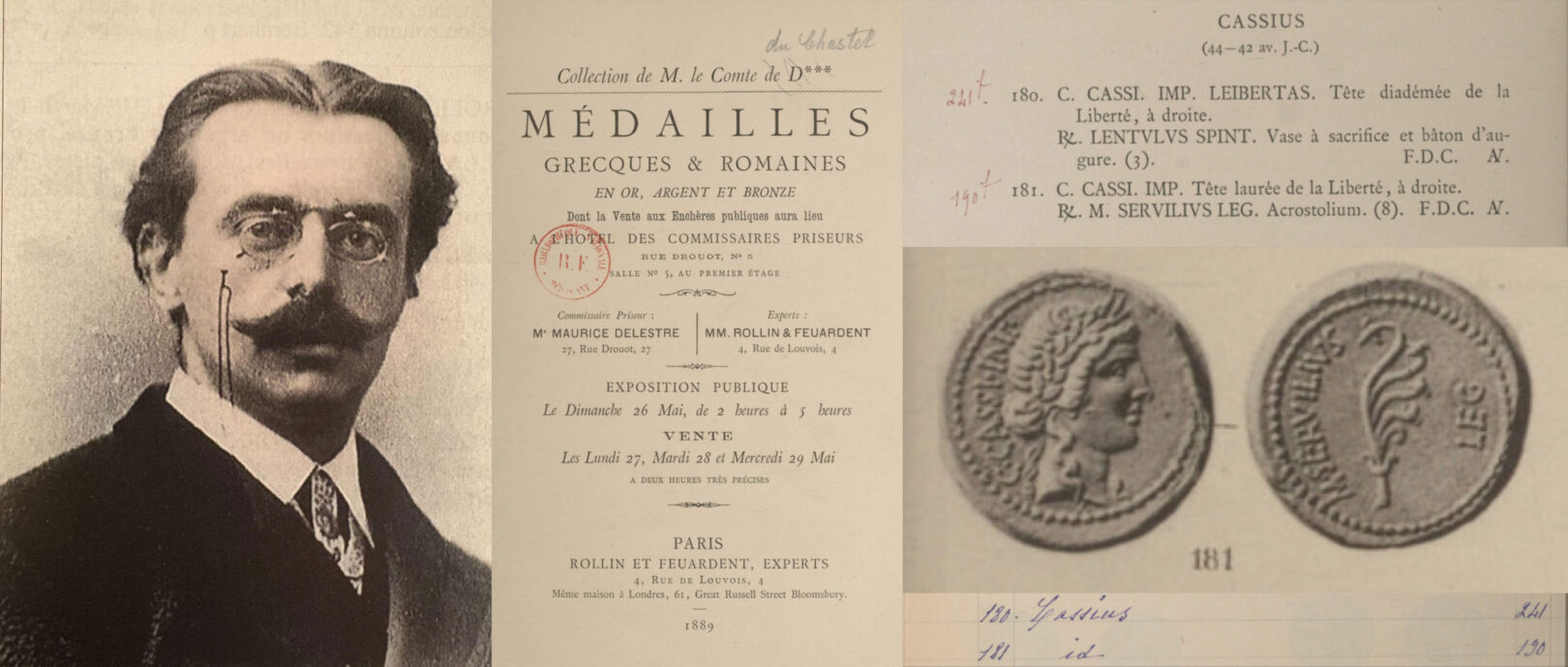 The coin begins its recorded journey as a plated coin in the collection of the Belgian Vicomte Albéric du Chastel de la Howardries (1842-1919), displayed with a plaster cast in the splendid 1889 sale of 646 of his coins at Rollin et Feuardent in Paris.