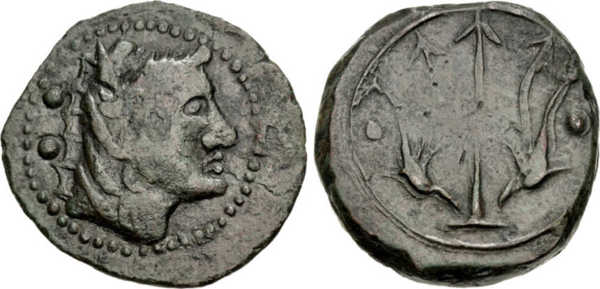 Coins from the city of Vetulonia are also occasionally found at auctions. The most common type shows a male head on the front, whose headdress consists of a sea monster known to the Greeks as Ketos. This head is therefore thought to represent the Etruscan god Nethuns. We can imagine Nethuns’ sphere of influence to be similar to that of the Roman god Neptune. This would make sense, as Vetulonia owed its prosperity to trade across the Mediterranean.